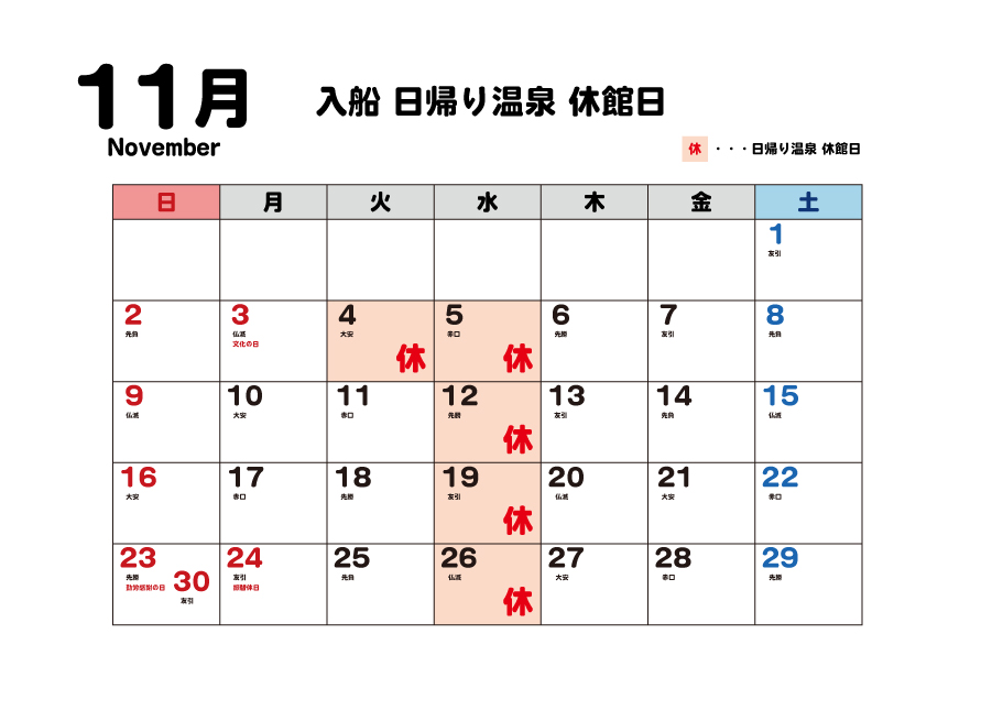 11月♨日帰り温泉営業のお知らせ 投稿日: 2025年10月22日2025年10月22日 投稿者: simple いつもご利用いただき、誠にありがとうございます。11月の日帰り温泉休館日のお知らせです。・4日(火)・毎週水曜日 ご来館お待ちしております。