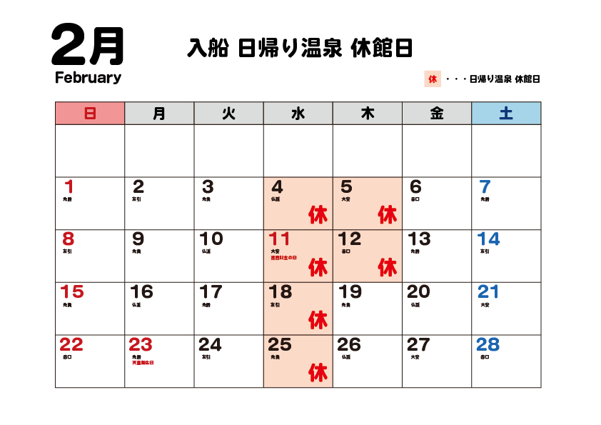 2月日帰り温泉営業のお知らせ 投稿日: 2026年1月22日2026年1月22日 投稿者: simple いつもご利用いただき、誠にありがとうございます。2月の日帰り温泉休館日のお知らせです。・毎週水曜日 ・5日(木)・12日(木)ご来館お待ちしております。